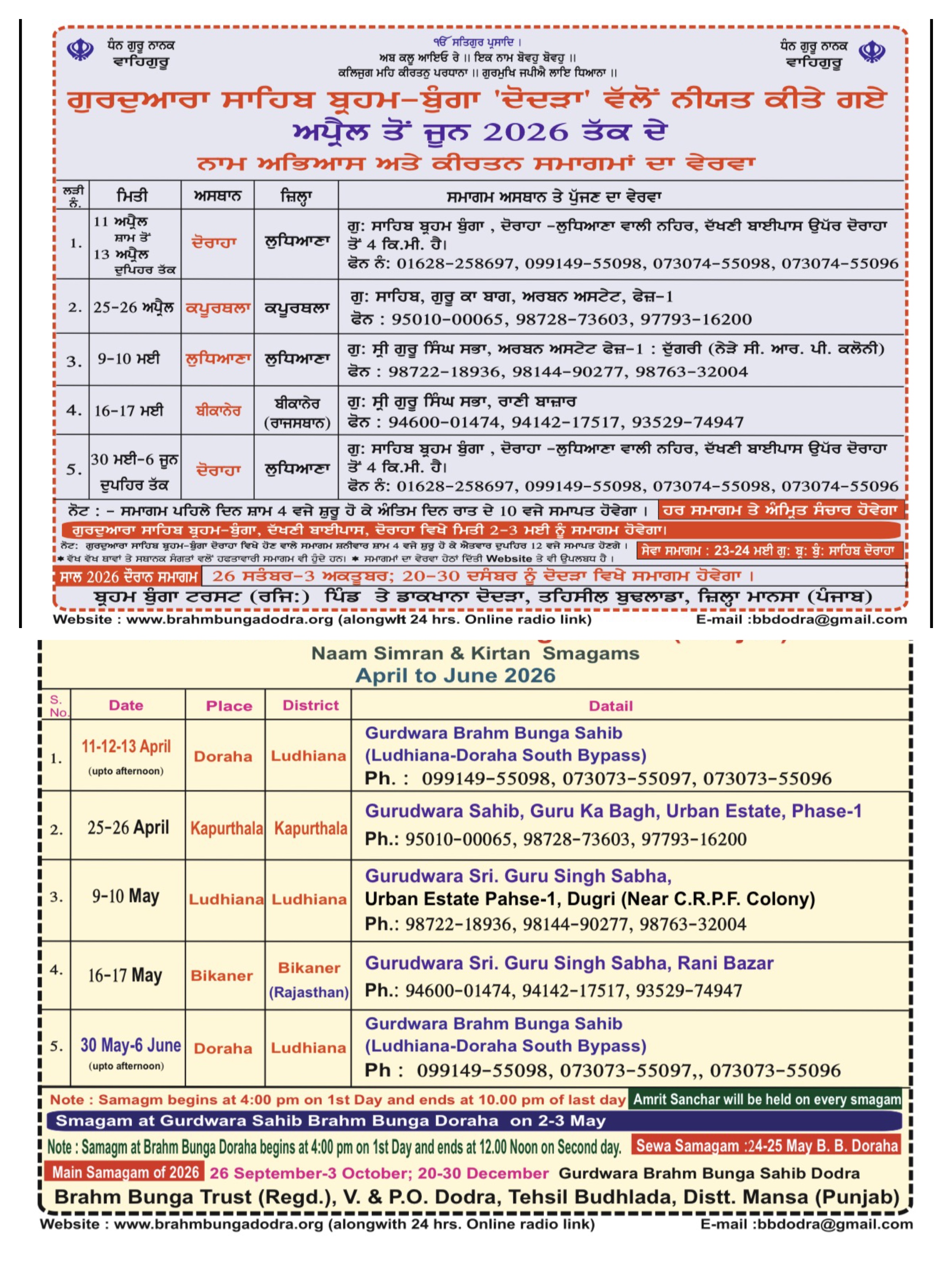 This is the official website of Gurudwara Sahib Brahm Bunga, Dodra & will provide the latest information, regarding satsang samagams organised by Gurudwara Brahm Bunga Sahib, Dodra and local samagams organised by Dodra sangat.